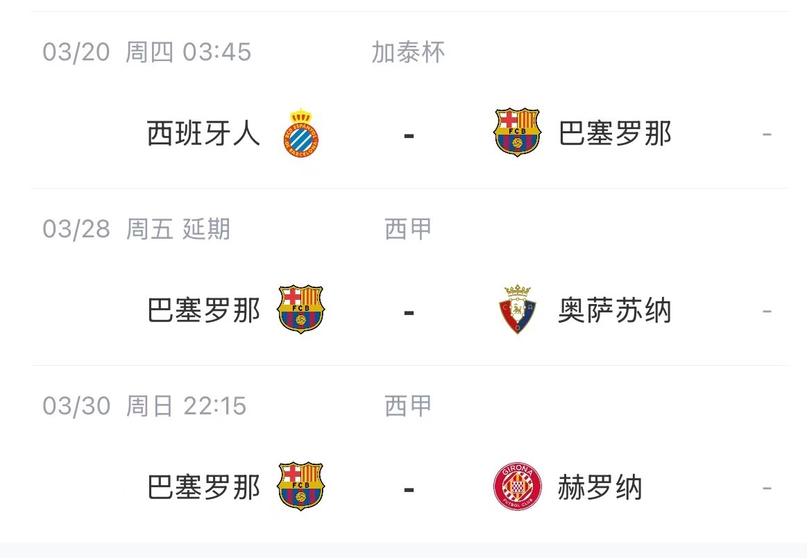 西甲第27輪巴薩vs奧薩蘇納的比賽原定于北京時間3月9日4:00進行,但賽前巴薩隊醫(yī)突然不幸離世,因此西甲同意將本場比賽延期。盡管兩隊都希望補賽安排在最后兩輪之間,但現在這場比賽被定在當地時間3月27日進行。