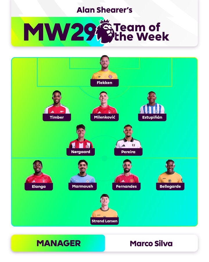 中場:諾爾高(布倫特福德)、佩雷拉(富勒姆)、伊蘭加(諾丁漢森林)、馬爾穆什(曼城)、B費(曼聯(lián))、貝萊加德(狼隊)