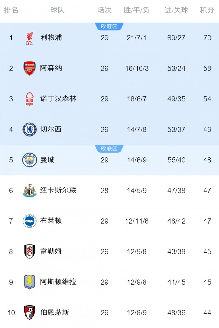 OPTA預(yù)測英超爭五概率:森林85.6%領(lǐng)跑,曼城紐卡藍(lán)軍次之