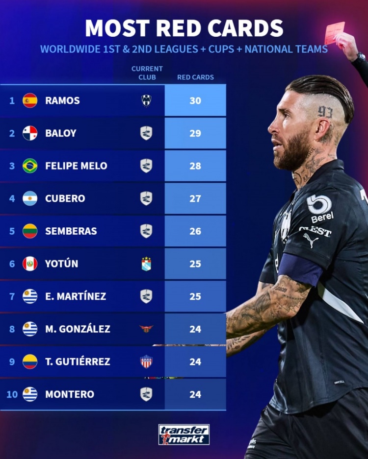 拉莫斯本輪聯(lián)賽踢人染紅,職業(yè)生涯至今吃到30張紅牌球員中最多