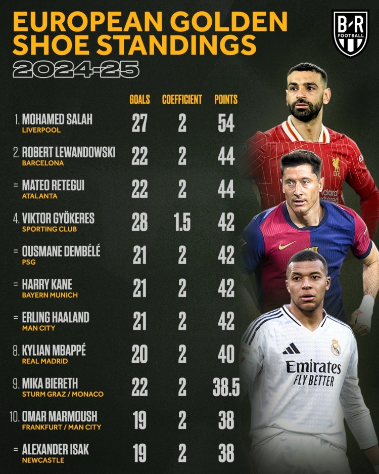 本賽季歐洲金靴排名:薩拉赫54分領(lǐng)跑,萊萬(wàn)、雷特吉44分次席