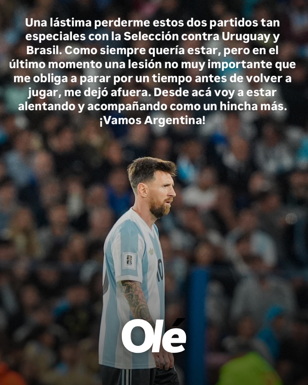 隨后,梅西在社媒上發(fā)文表示:“非常遺憾我將錯過與烏拉圭和巴西的兩場比賽。盡管我始終渴望參賽,但最后一刻出現的輕微傷勢迫使我必須休養(yǎng)一段時間才能重返賽場,這讓我無法參與此次賽事。在此我將作為一名普通球迷繼續(xù)為球隊加油助威。阿根廷加油!”