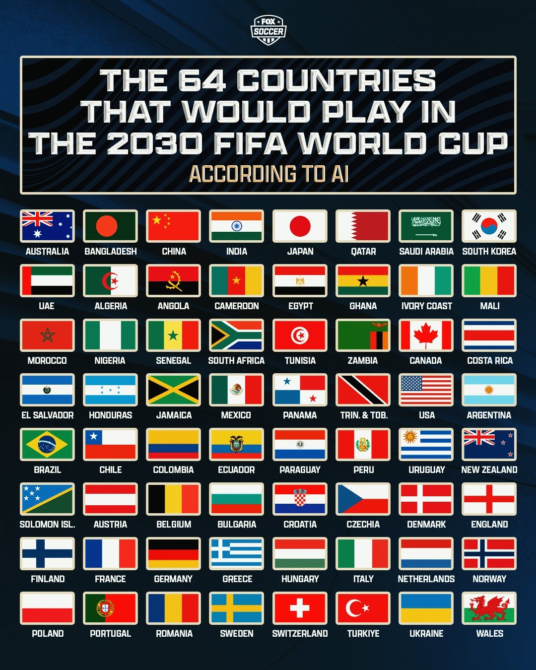 福克斯足球發(fā)文,表示要求ChatGPT列出如果2030世界杯擴軍64支隊后所有的64個國家。同時福克斯寫道:你覺得這種形式是個好主意嗎?