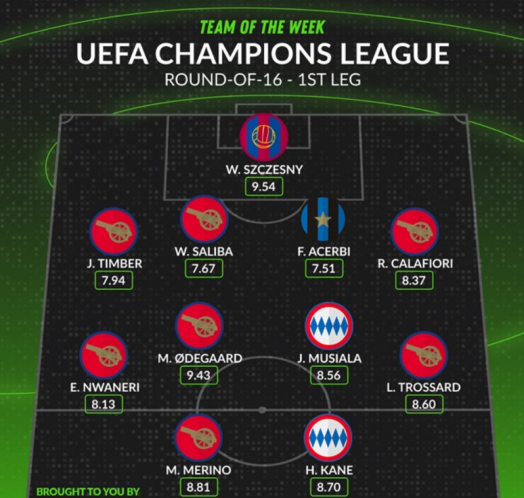 Whoscored評(píng)本輪歐冠最佳陣:厄德高領(lǐng)銜阿森納7人入選,凱恩在列