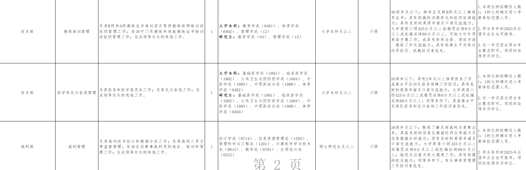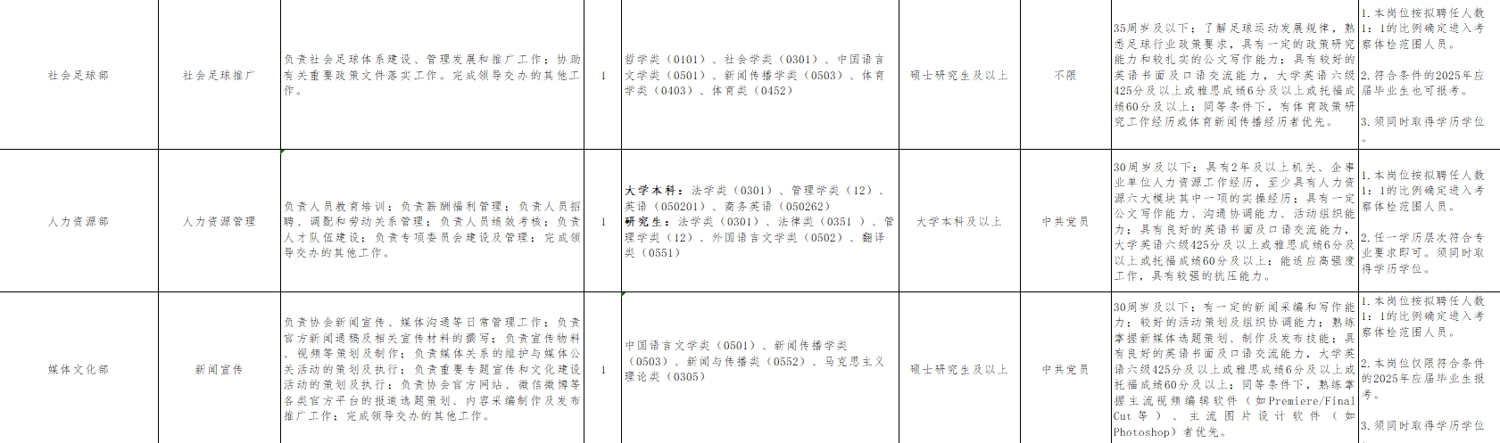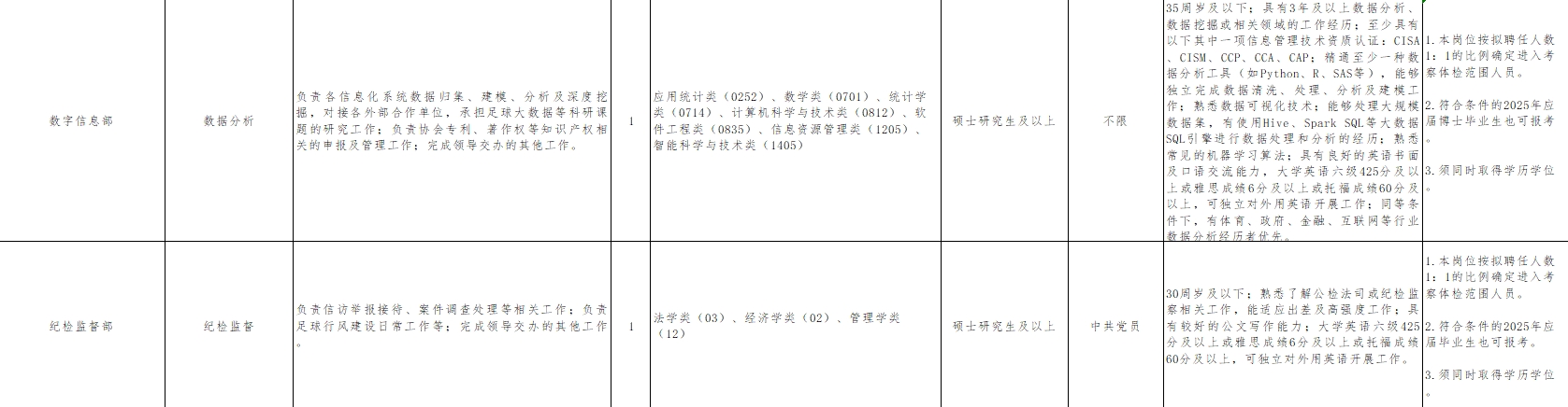 另外,綜合部(財(cái)務(wù)審核)、國(guó)家隊(duì)管理部(隊(duì)伍管理)、裁判部(裁判管理)、社會(huì)足球部(社會(huì)足球推廣)、媒體文化部(新聞宣傳)、數(shù)字信息部(數(shù)據(jù)分析)、紀(jì)檢監(jiān)督部(紀(jì)檢監(jiān)督)要求學(xué)歷為碩士研究生及以上,其余崗位為大學(xué)本科及以上。
