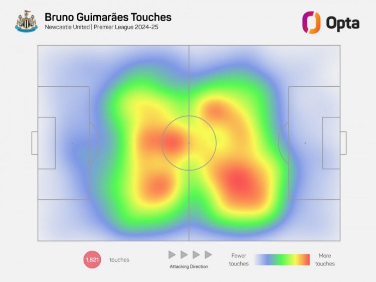 熱力圖B2B!紐卡核心吉馬良斯本賽季跑動310.9公里,英超同期最多