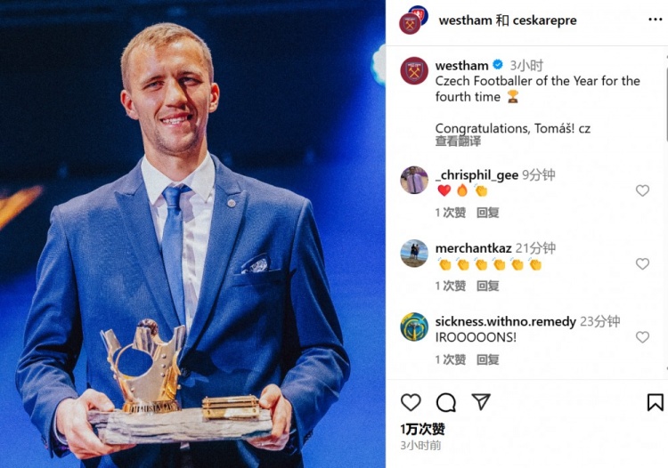 西漢姆官方賬號也轉(zhuǎn)發(fā)了該消息,并配文:“第4次當(dāng)選捷克足球先生。祝賀你,紹切克!”