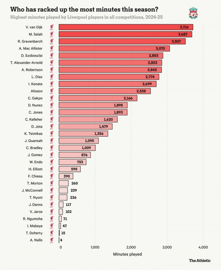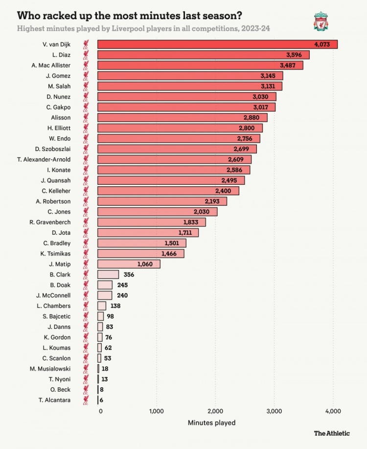 從時間分布看差異更明顯:2023-24賽季有10人出場時間在2000-3000分鐘區(qū)間。而按照現(xiàn)有趨勢推算,本賽季利物浦最多僅有6人處于該區(qū)間(其中還包括了替補門將凱萊赫和左后衛(wèi)齊米卡斯)。