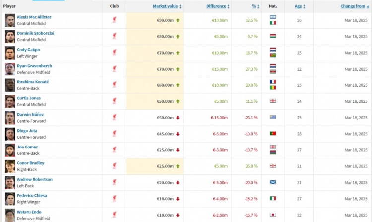 利物浦身價更新:“麥8赫”組合均上漲,努涅斯下跌1500萬歐